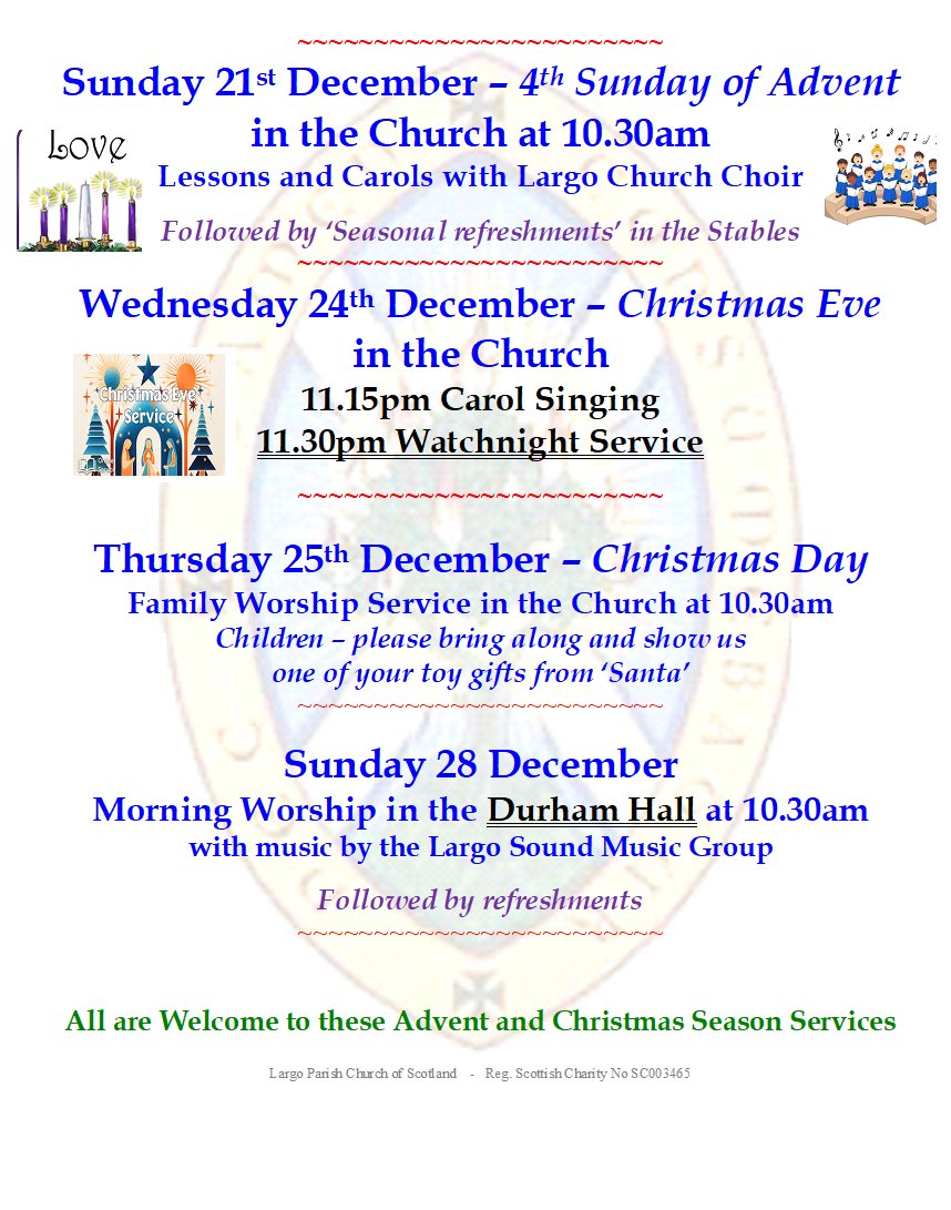 Sunday 28th December – Morning Worship in the Durham Hall at 10.30amWith music by the Largo Sound Music Group, followed by refreshments